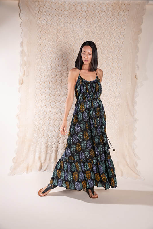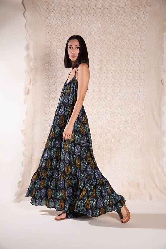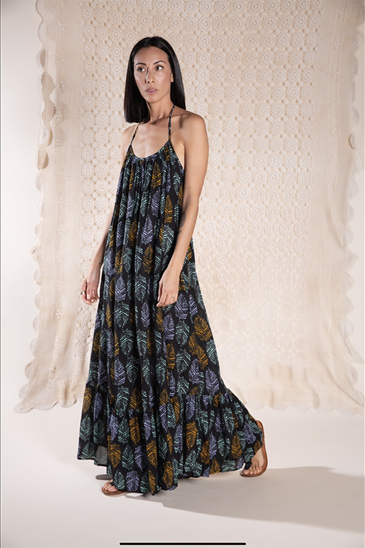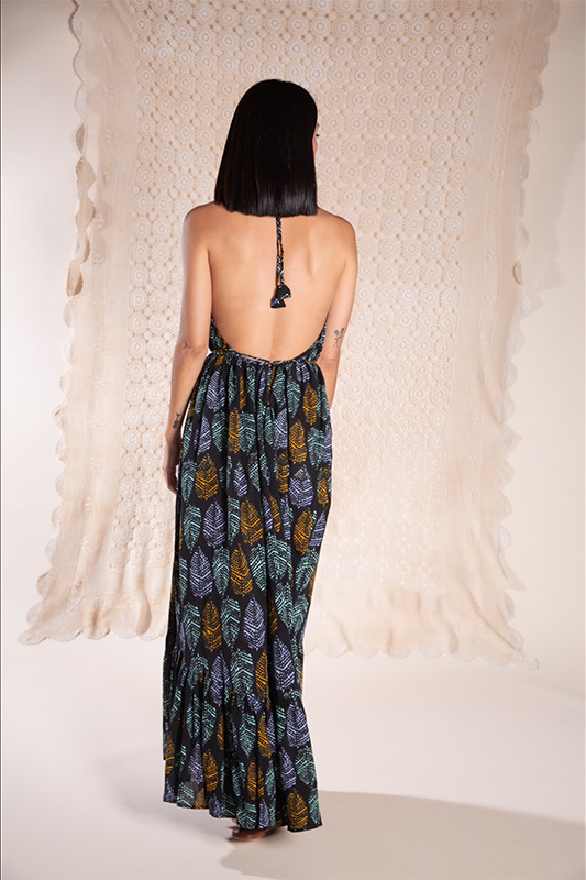 Para esta prenda el tejido se ha estampado primero según la técnica de serigrafía y posteriormente se le han aplicado los colores de fondo utilizando una esponja impregnada de tinte; cada color de fondo se aplica por separado y crea un efecto diferente en cada prenda.