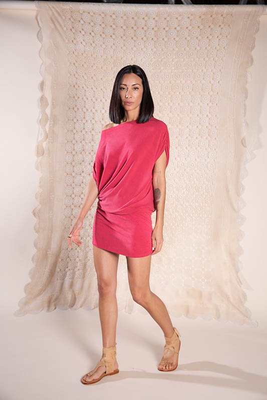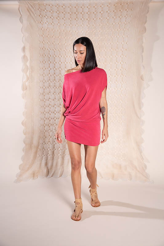 Nuestro vestido Nayem está confeccionado en tejido de punto, rayón con un 10 % de licra, fabricado a partir de la extracción de la celulosa proveniente de madera de pino.