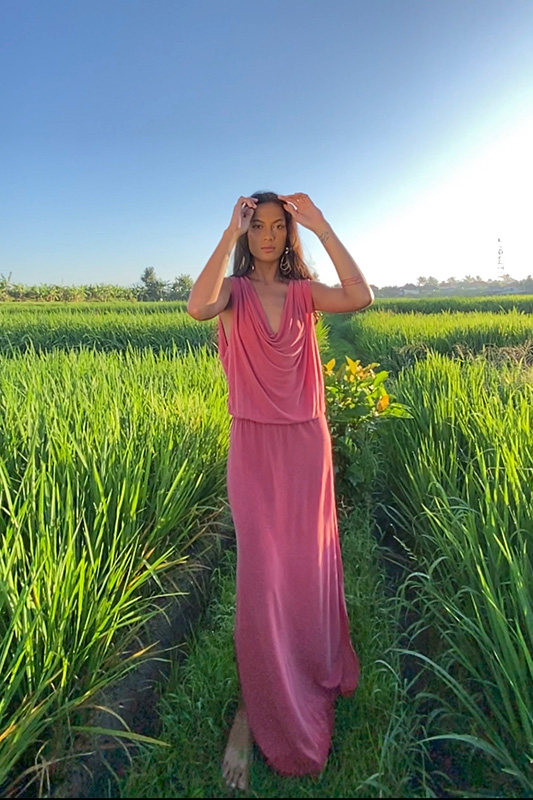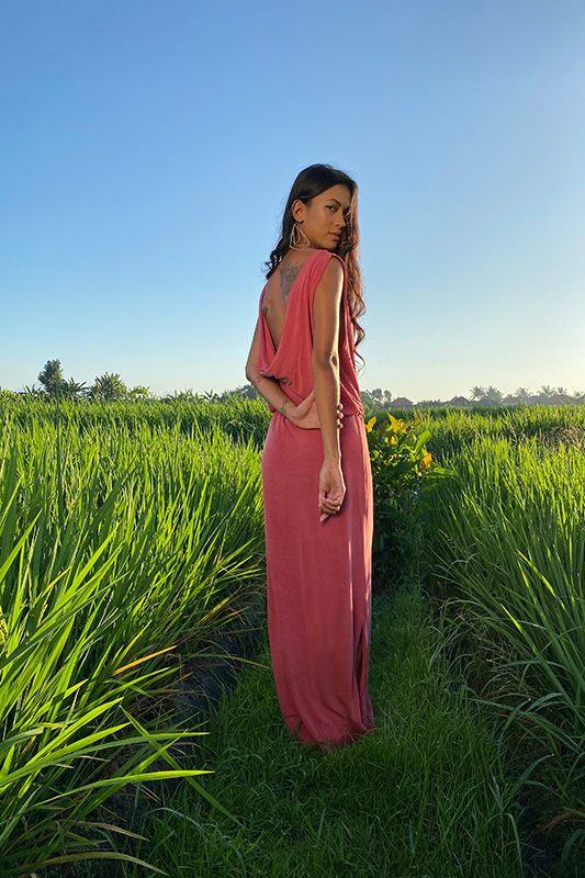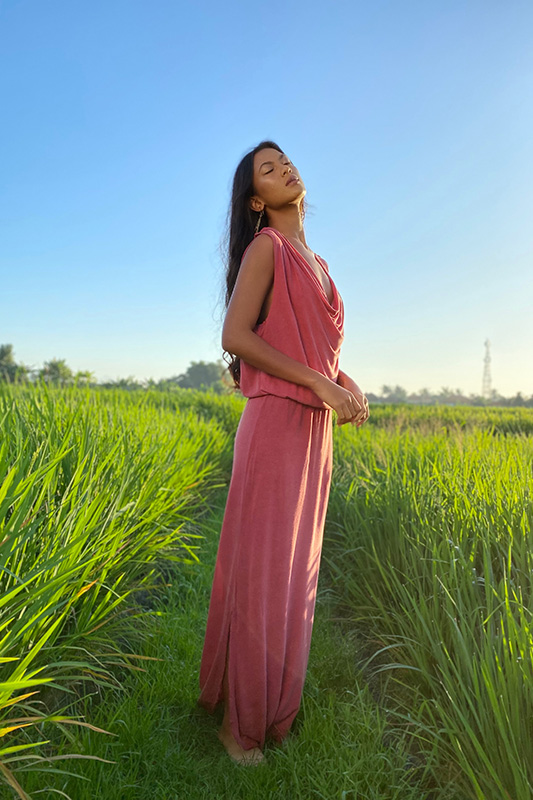 Escote drapeado y espalda baja; con elástico en la cadera. Confeccionado en tejido de punto a partir de la celulosa extraída de la fibra del bambú.